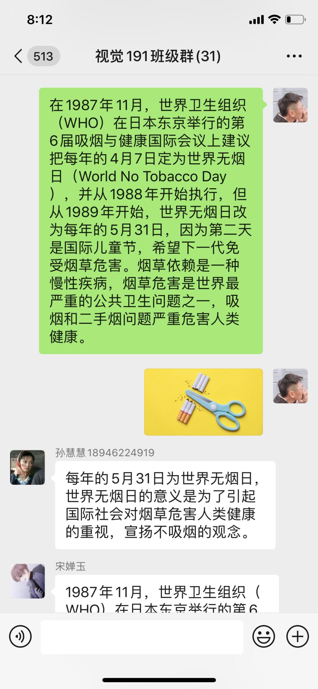 2020年5月31日,视觉191班在宣传委员闫立民的组织下于班级微信群开展线上“世界无烟日”主题团活。此次活动由闫立民主持,视觉191班全体同学参加。