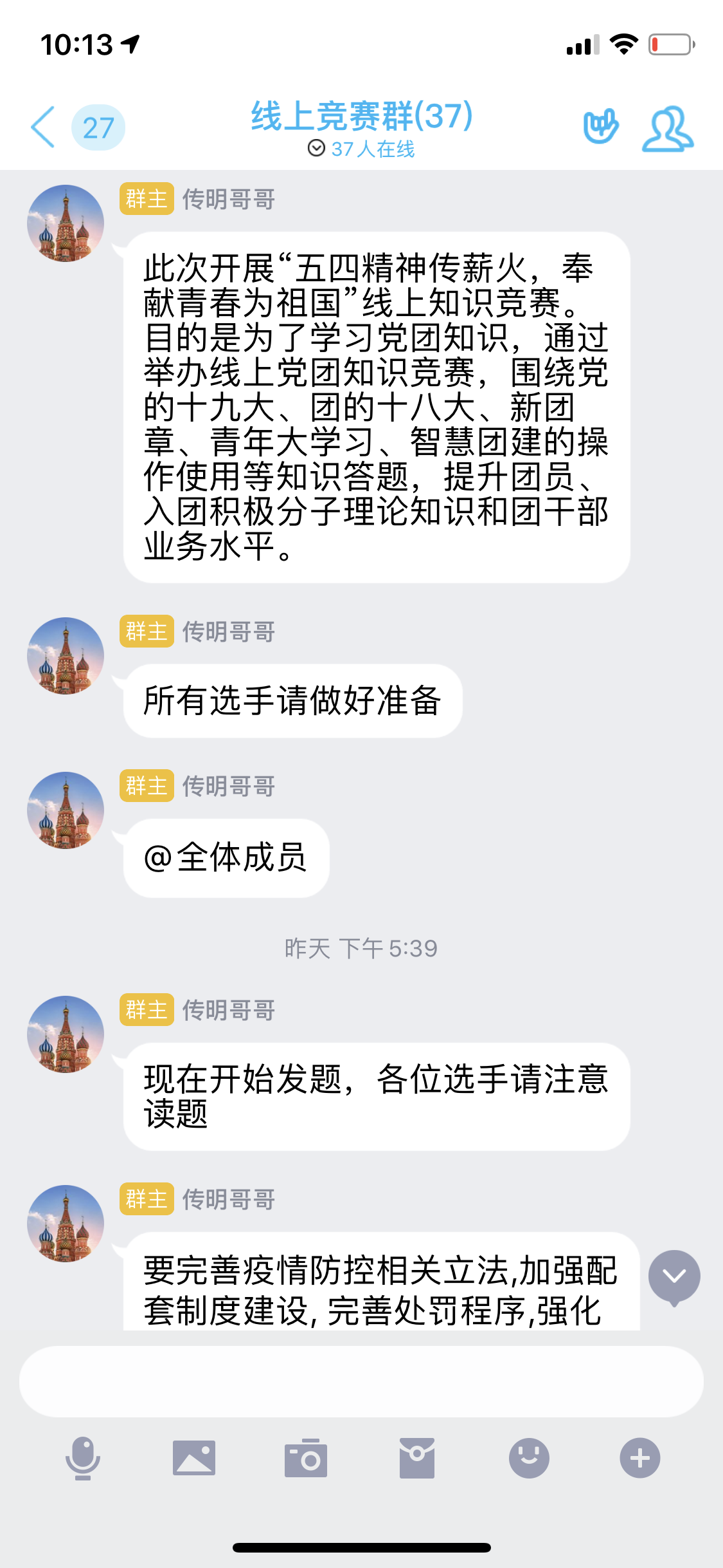 2020年5月20日,信息工程系团总支于QQ群开展“五四精神传薪火,奉献青春为祖国”主题线上知识赛竞。此次竞赛由宣传部部长唐传明主持,同学们都踊跃报名参加。