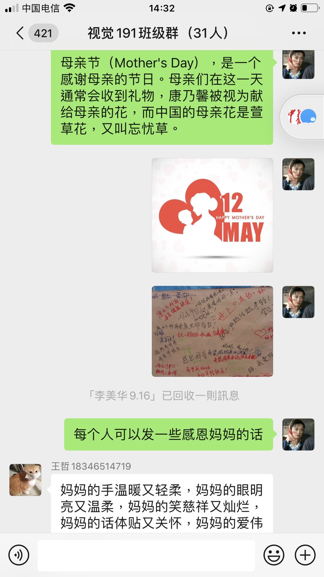 2020年5月9日,视觉191班在组织委员孙慧慧的组织下于班级微信群开展此次母亲节“感恩母亲”主题团活。此次活动由孙慧慧主持,视觉191班全体同学参加。