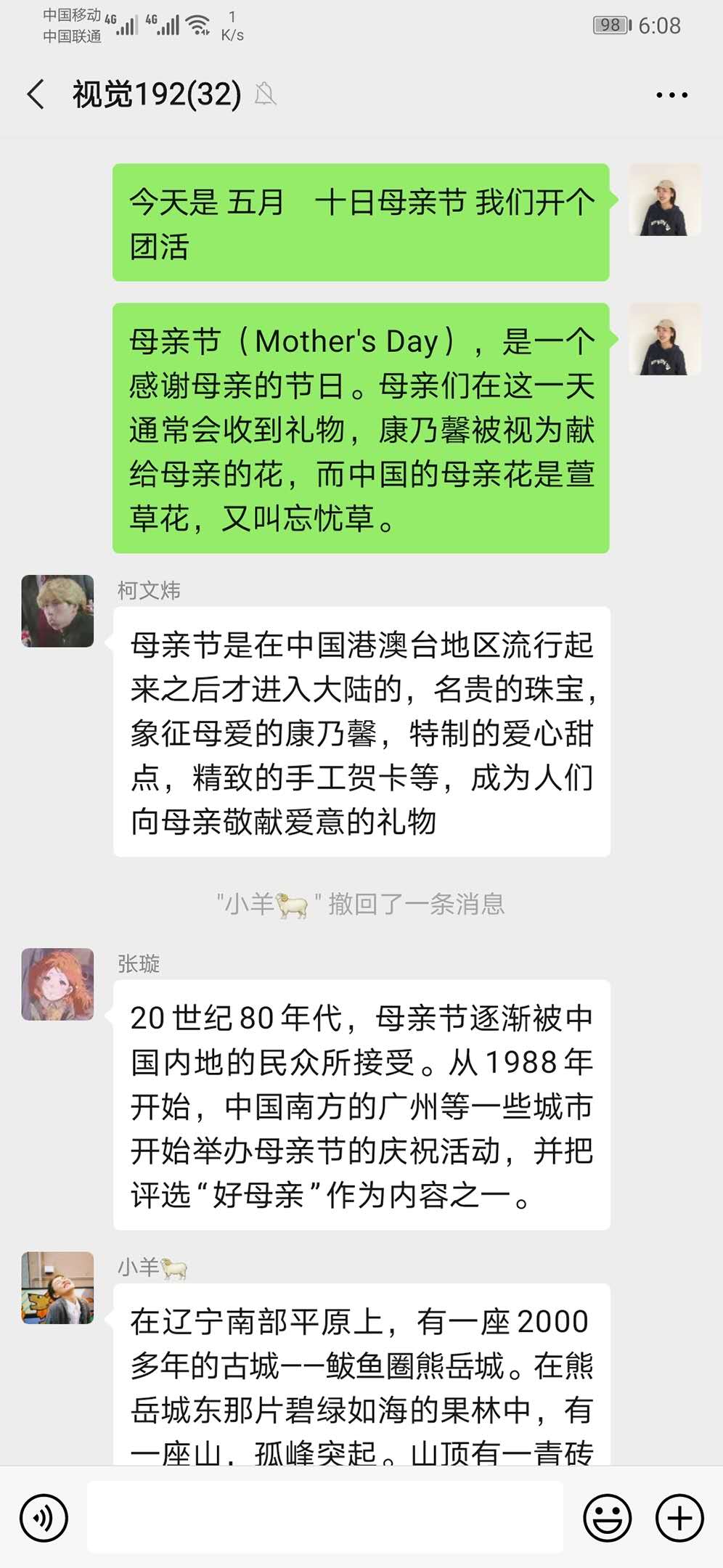 在母亲节来临之际,视觉192班于2020年5月9日在线上开展了以花之名,献给母亲的团活动。目的是为了让在家学习的同学们能够在这一天里大声的表达自己对妈妈的爱,与家人增进感情。