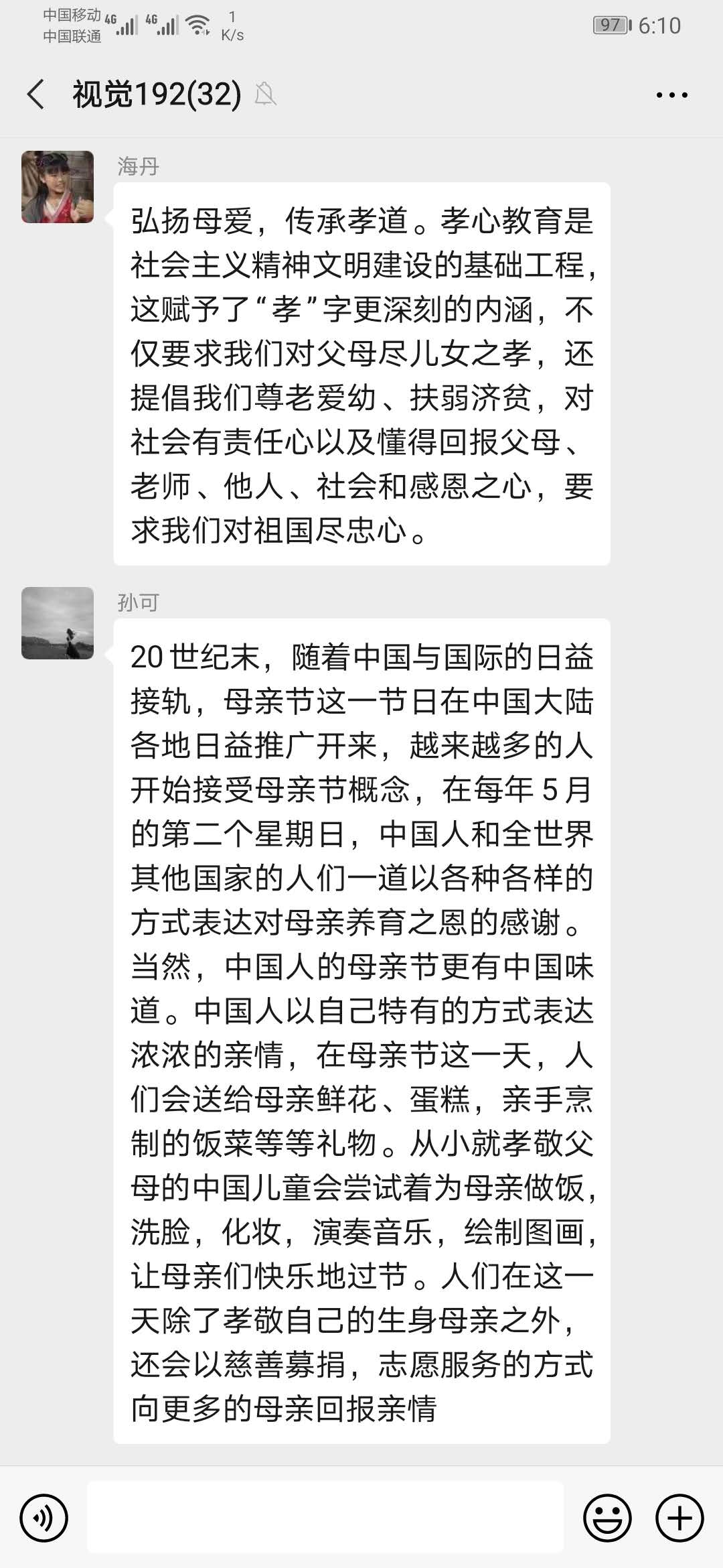 活动开始,组织委员在班级群里上发了自己送给母亲的康乃馨,并向大家普及了母亲节的来源,同学们了解到母亲节最早出现在古希腊,而现代的母亲节起源于美国,日期在公历5月的第2个星期日,同学们也开始对母亲节送给母亲什么花最合适的话题开始讨论,萱草,在中国一向有“母亲花”的美称。而康乃馨则代表着魅力、真情,温馨的祝福、热爱着你、不求代价的母爱、亲情思念。其实同学们都明白,无论什么礼物都比不上爱母亲的一颗真心和实际行动。