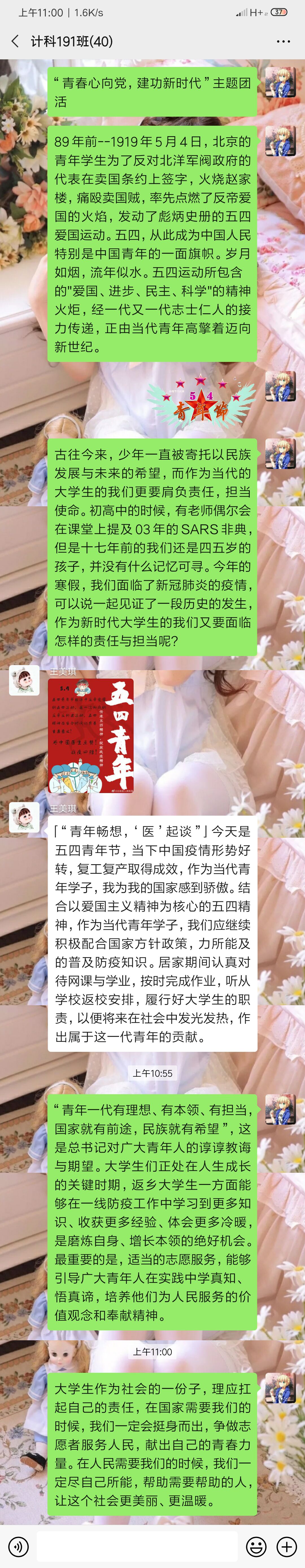 2020年5月4日计科191班由组织委员张宏宇组织召开“青春心向党,建功新时代”主题线上团活,计科191班全员参加。