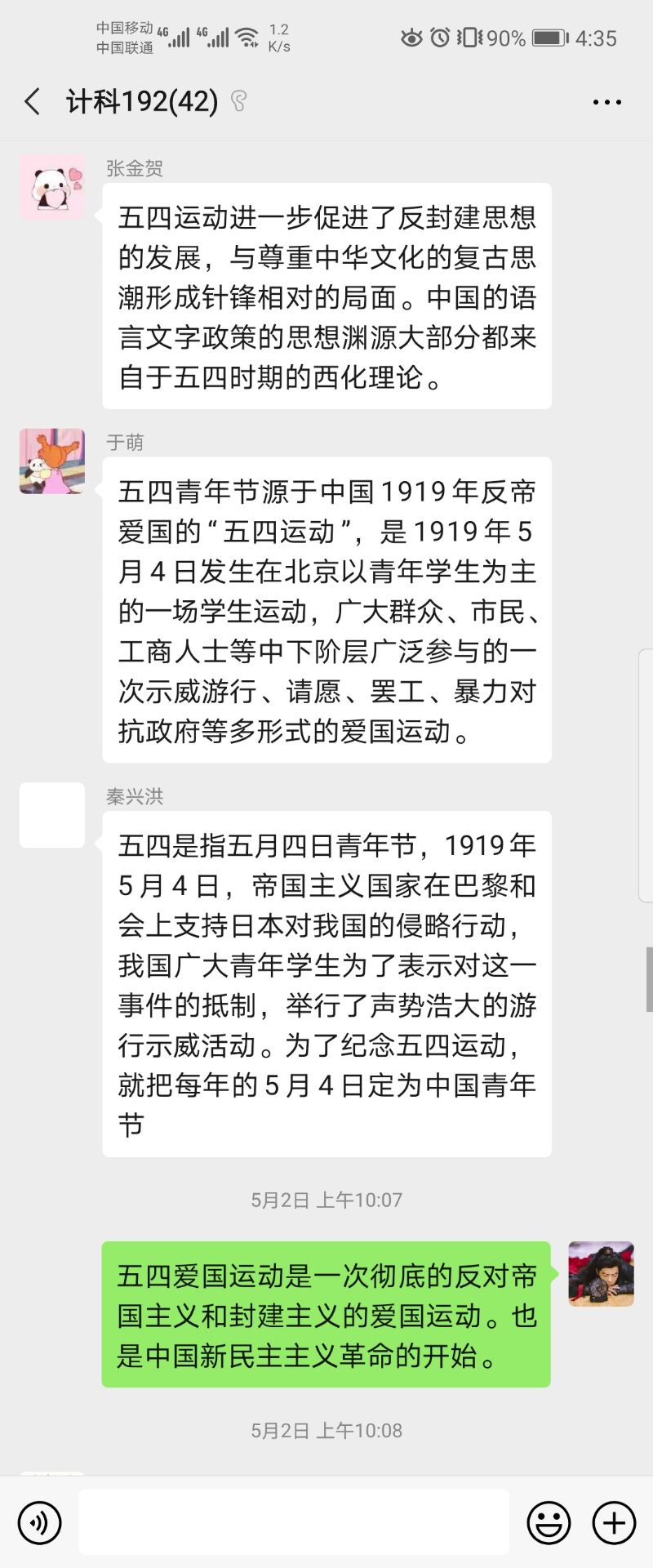 2020年5月4日,计科192班全体同学于微信平台开展“五四青年节”主题团活,计科192班组织委员李嘉新主持,计科192班全体同学共同参与。