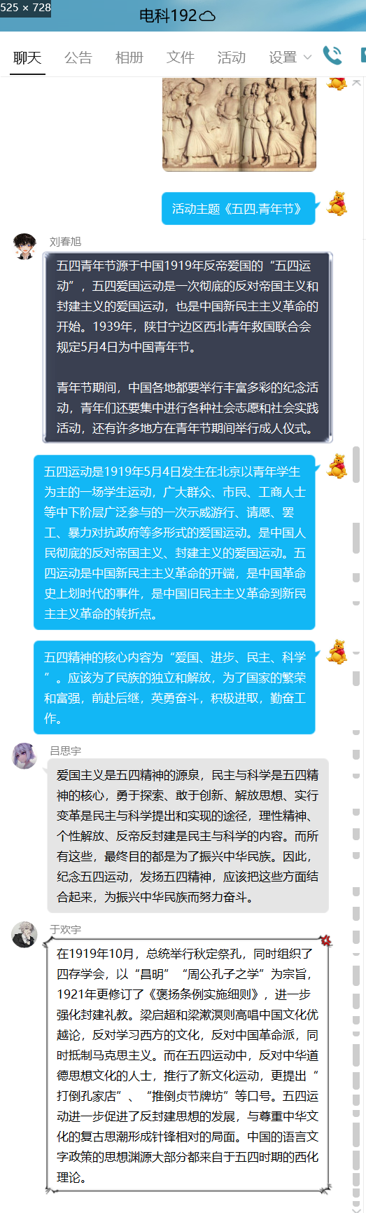 正值“五一”.虽疫情期间但不能忘记劳动人民的本质,所以电科192班于2020年4月30日在QQ群开展“五一劳动节”主题活动,此次活动由组织委员孙天泽主持电科192班全员参加。