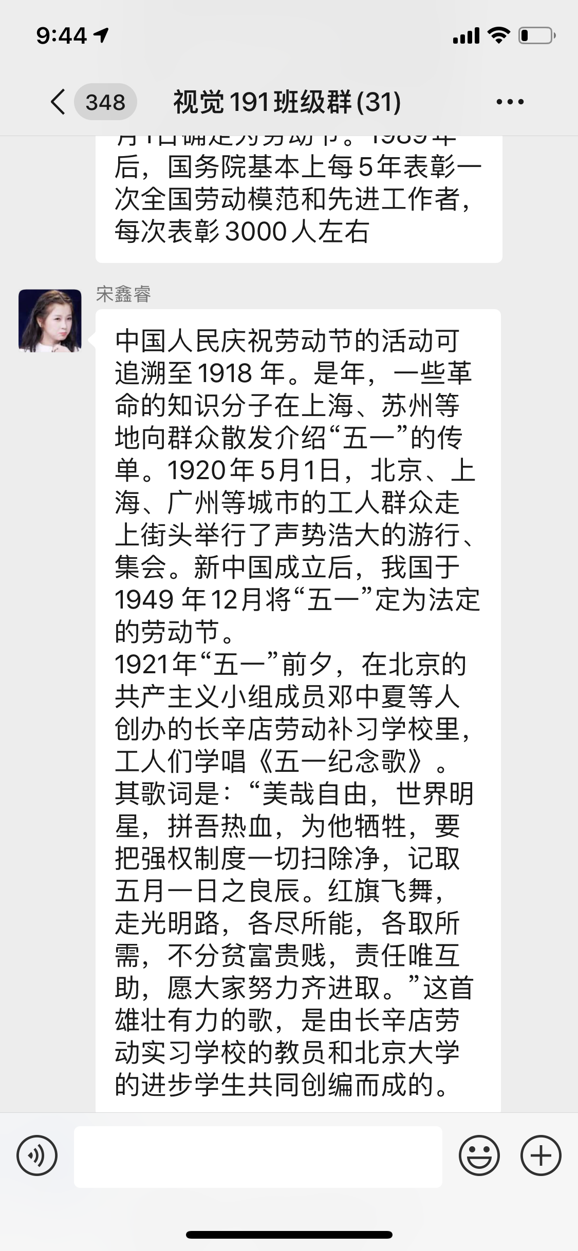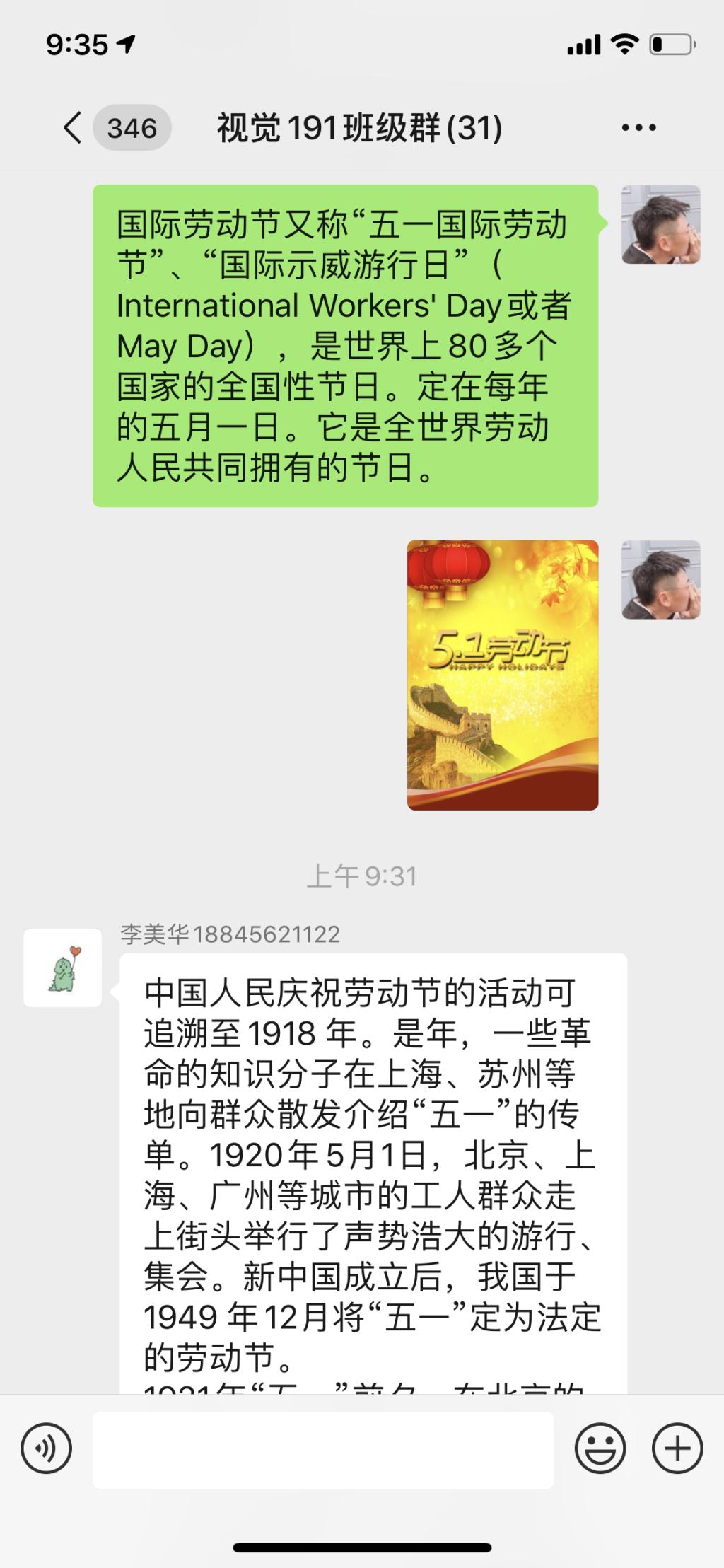 2020年4月30日,视觉191班在宣传委员闫立民的组织下于班级微信群开展劳动节“劳动最光荣”主题团活。此次活动由闫立民主持,视觉191班全体同学参加。
