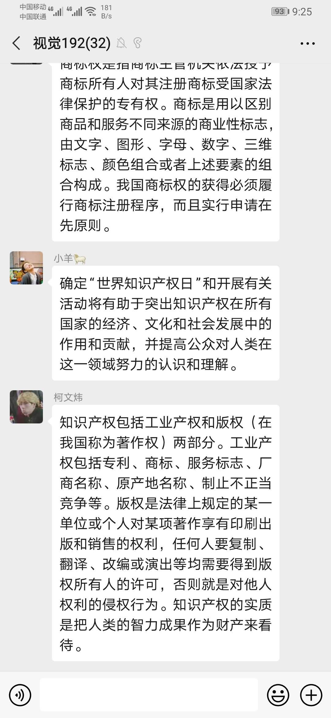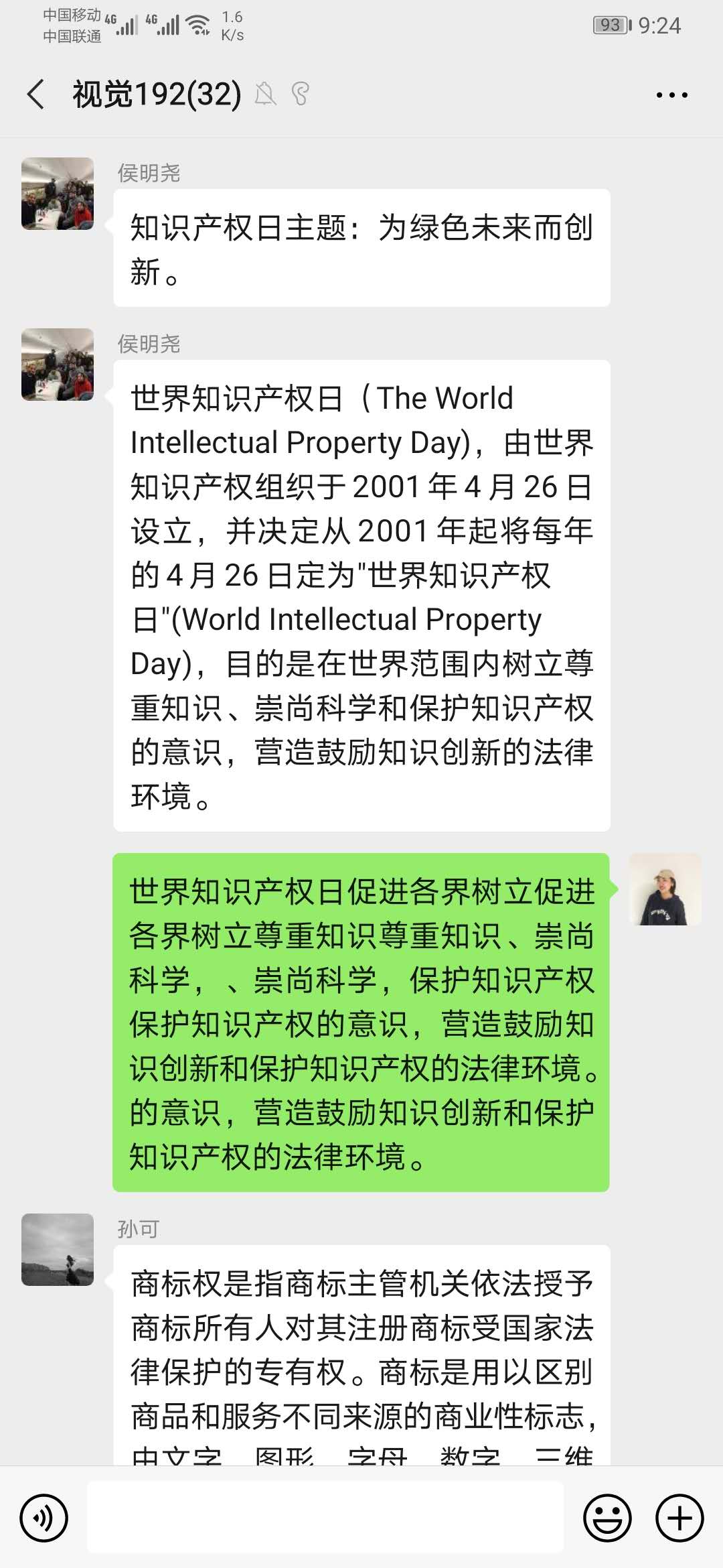 为了树立学生尊重知识、崇尚科学和保护知识产权的意识,营造鼓励知识创新的法律环境。视觉192班同学于4月26日在班级微信群里云开展了有关世界知识产权日的主题团活。