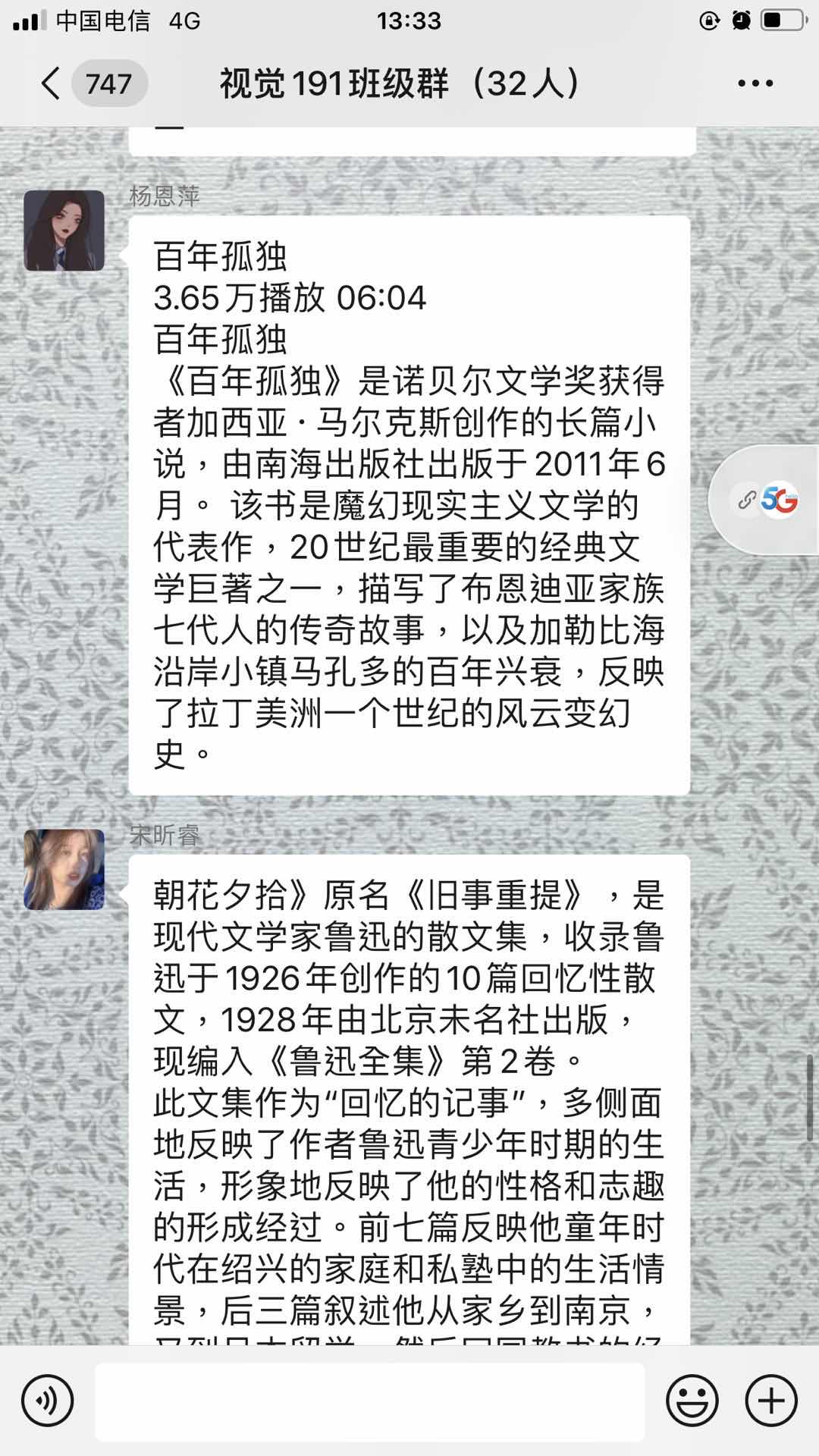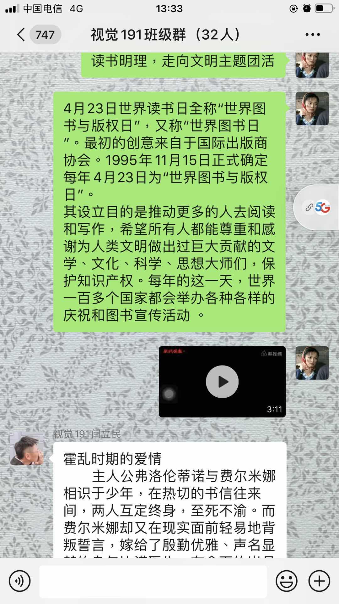 2020年4月23日,视觉191班在组织委员孙慧慧的组织下于微信班级群开展线上“世界读书日”主题团活。此次团活由孙慧慧主持,视觉191班全体同学参加。