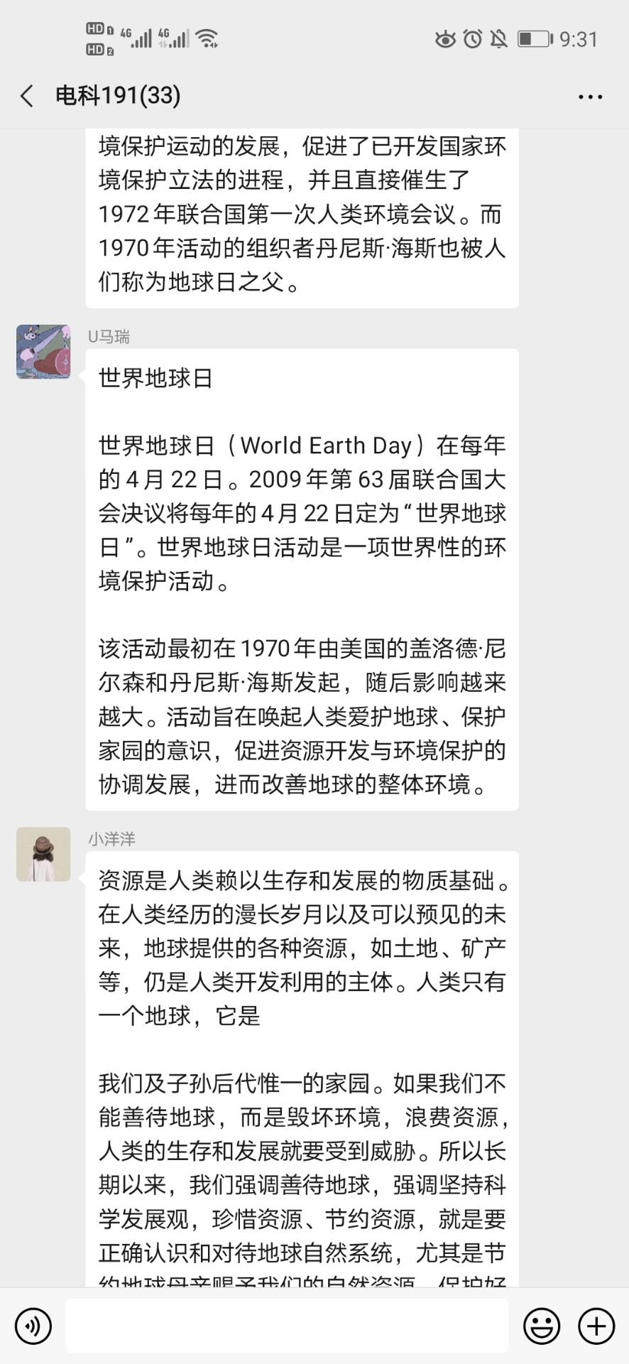 为提高同学们环境保护意识,倡导绿色低碳生活。电科191班于2020年4月22日在班级微信群里开展了世界地球日主题团活,本次会议由组织委员康佳慧主持,电科191班全体同学参加。