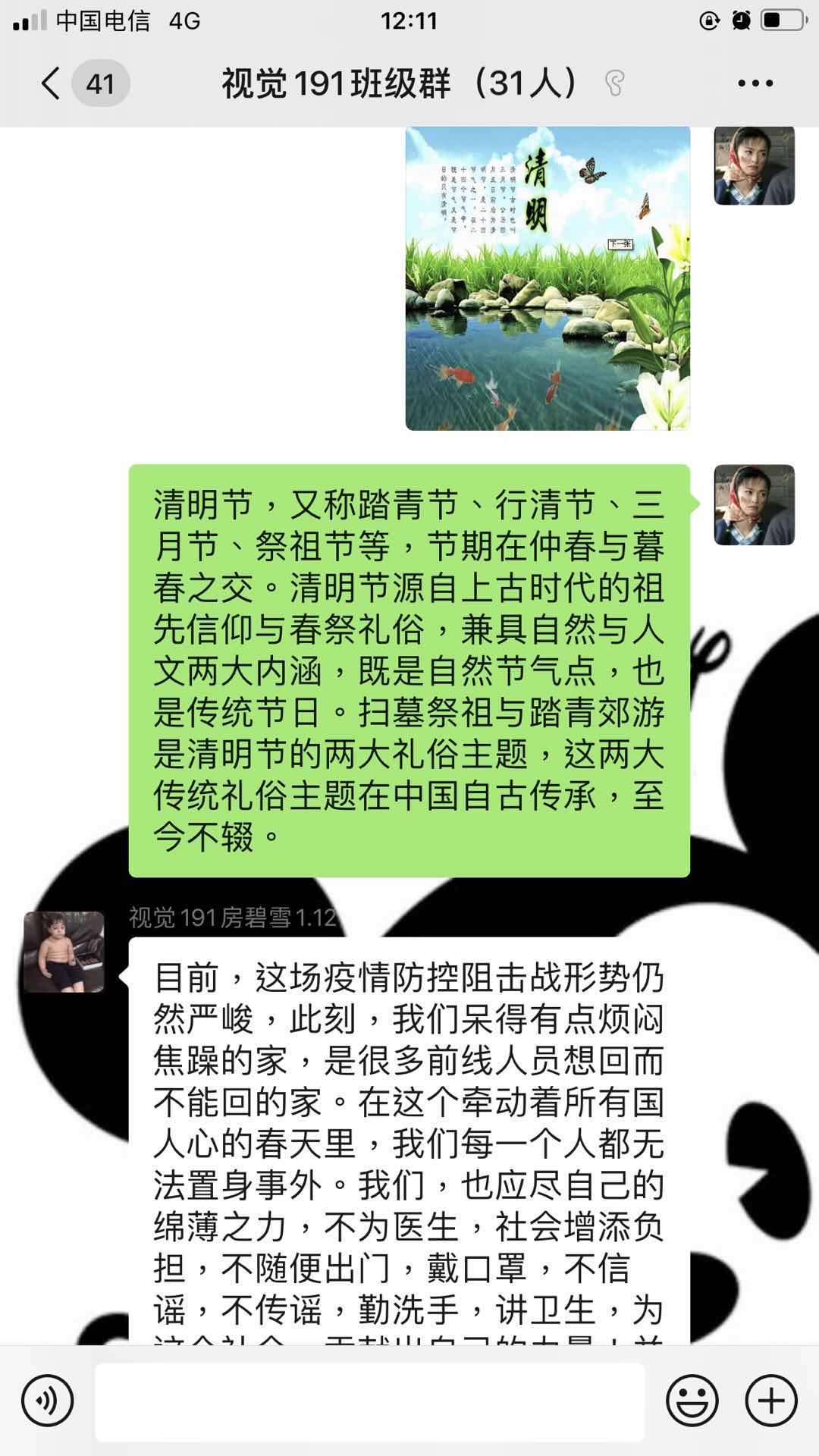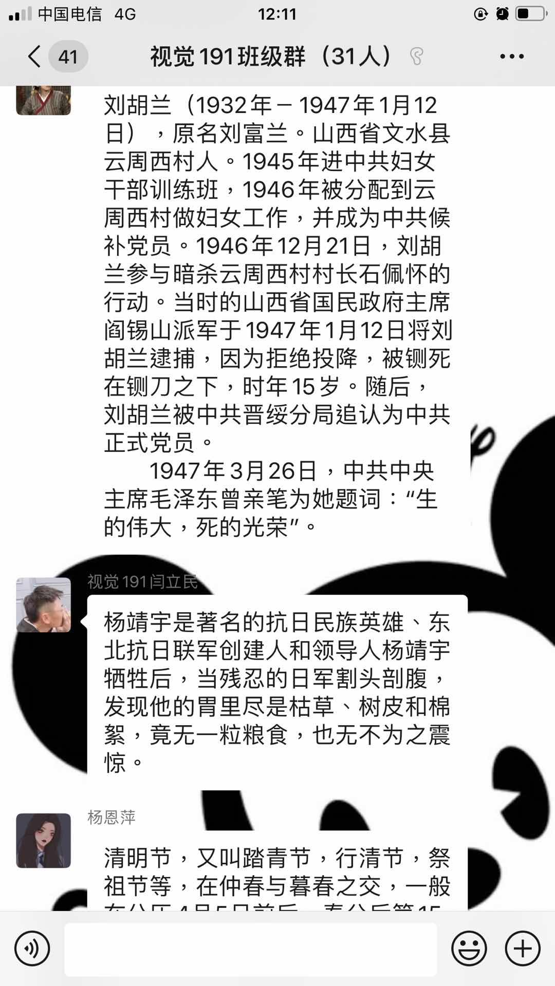 2020年4月2日,由于疫情的特殊原因,组织委员孙慧慧带领我们在微信班级群开展了此次“清明节祭奠英烈”主题活动,此次活动由孙慧慧主持,全体同学参加。
