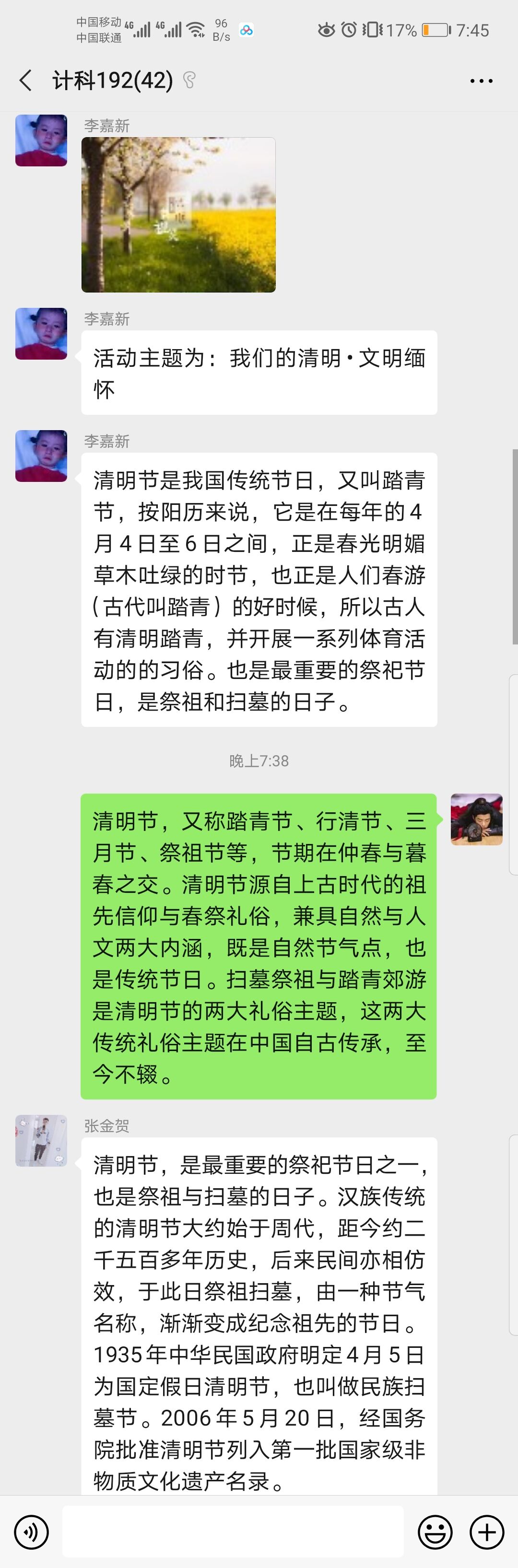 活动一开始,首先由组织委员李嘉新向同学们做表率,简单解释清明节的由来。随后由同学们展开了有关清明节的讨论,每个人在微信平台上分享了自己所知的清明节的习俗。最后借清明节为契机,悼念革命先烈,缅怀先烈的丰功伟绩,同学们一起在群内分享了革命先烈的光荣事迹,向烈士表达自己的无限敬意和哀思,让同学们知道了当年革命先烈如何在艰苦的条件下与敌人艰苦战斗,知道今天的幸福生活来之不易。珍惜现在,珍惜当下,不忘初心。