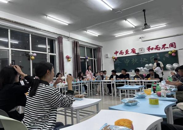 首先,辅导员郭磊老师为各位同学送上中秋祝福,并为各位同学新生分发烤鸭与月饼。随着温暖的祝福声,来自五湖四海的同学介绍了其自己家乡的习俗与文化,在同学们的惊叹声中开启了这场中秋联欢会,新生们准备了许多精彩的节目,其中一首《后来的我们》让同学们纷纷拍手叫好。之后,两个班级的班长与各位学长主持了击鼓传花的游戏,学长们与新生们一同表演,玩游戏,让本次中秋联欢会在欢声笑语中度过。最后,全体同学共同举杯、吃月饼,庆祝中秋佳节的到来,本次活动也走进了尾声。联欢会现场欢声笑语,掌声阵阵。师生之情,同窗之谊弥补了同学们未能与家人团聚的遗憾。
