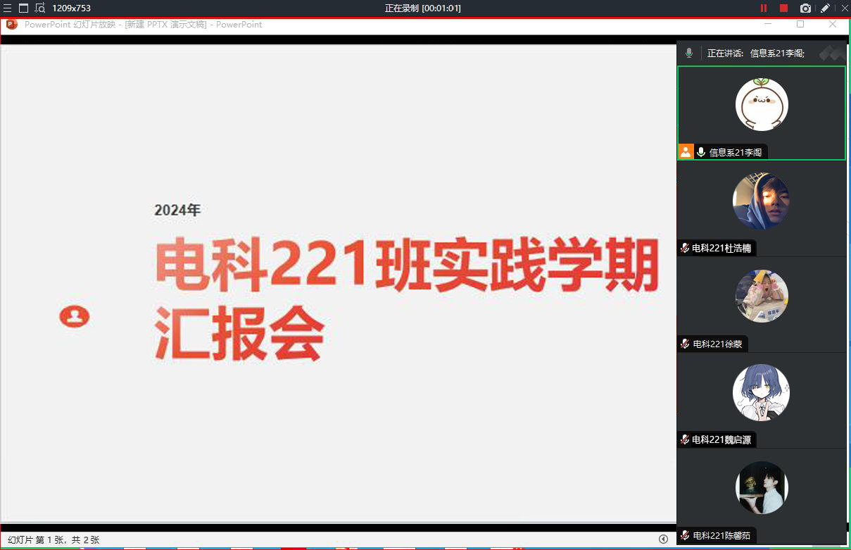 9月20日,电科221班召开专业实践学期期末汇报会,电科221班全员参加,会议由指导老师李阁老师主持。