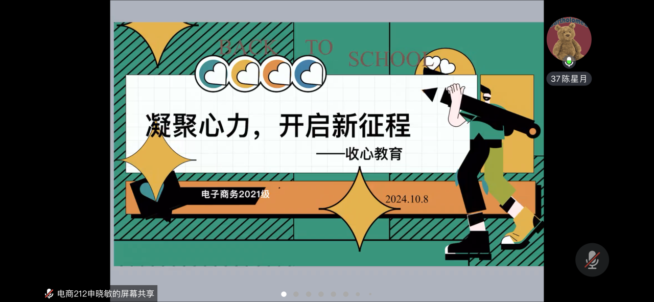 为帮助学生顺利从悠闲的假期生活中调整状态,以更加饱满的精神面貌迎接新的挑战。电子商务专业辅导员陈星月于10月8日下午16时在线上组织召开“凝聚心力 开启新征程”收心教育主题班会,电子商务21级全体学生参会。