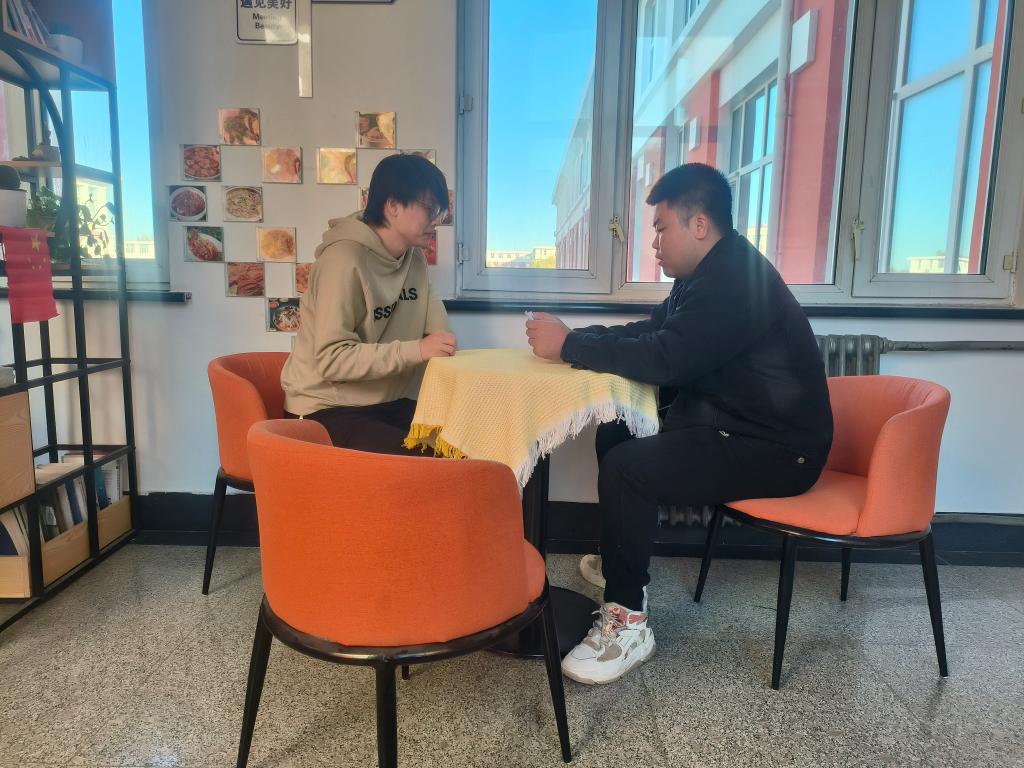 10月的11日下午,生涯导师沙梦涛在一号教学区3楼休息区,为毕业生贾旭同学安排了一次学业指导。