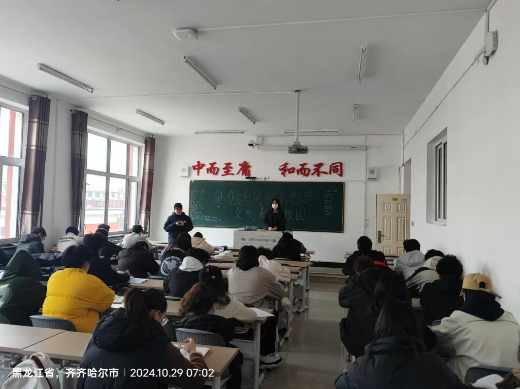 本次班会旨在引导学生树立正确的学习态度,共同创建文明和谐的校园环境。侯蕊同学先表扬了个别同学,讲述了优秀学风标兵的故事,引发同学们对良好学风和文明行为的思考。让同学们简单进行 “如何争当学风标兵” 等问题讨论。随后,同学们列举了一些校园中存在的不良学风和不文明行为的案例,如迟到早退、上课玩手机、乱扔垃圾等,分析这些行为的危害,并提出改进的建议。最后大家纷纷表示,在今后的学习和生活中,要以学风标兵为榜样,严格要求自己,努力提高学习成绩,养成良好的文明习惯。