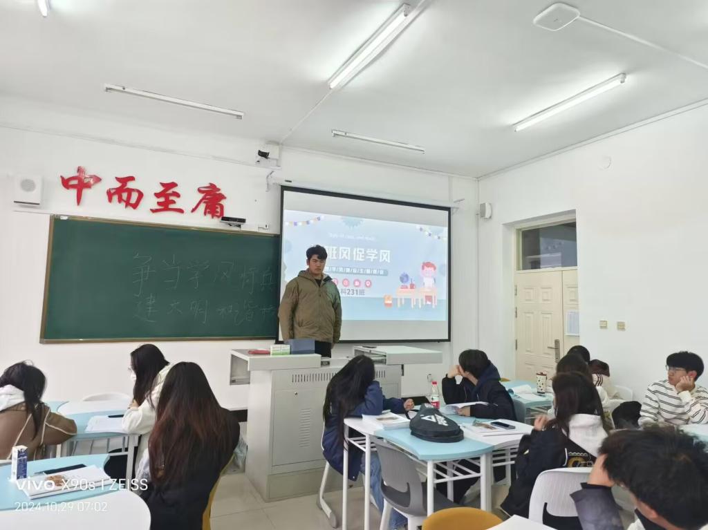此次班会主要以分享学习经验,激发同学们的学习热情为主要目的。首先班长崔建宇阐述了学风建设的重要性和紧迫性,指出良好的学风是班级文化的重要组成部分,直接影响到每位同学的学习成效和未来发展。随后强调,学风不仅关乎个人成长,更是班级乃至学校精神风貌的体现,鼓励大家从我做起,从现在做起,以实际行动促进班级学风的提升。紧接着特别邀请了上学期学习成绩优异、学习态度端正的几位同学作为代表进行经验分享。他们分别从时间管理、学习方法、心态调整等方面,向同学们传授了宝贵的学习经验和心得。最后崔建宇对本次班会进行了总结,她对同学们积极参与讨论、勇于提出问题的态度给予了高度评价,并鼓励大家将今天的讨论成果转化为实际行动,持之以恒地推进学风建设。