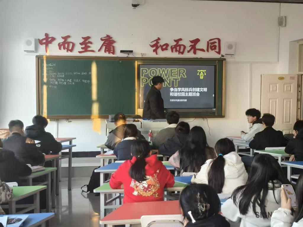 首先,班长刘睿详细阐述了优良学风的标准,包括勤奋好学、积极进取、尊师重道等,并结合实例展示了良好学风对学习效果的积极影响。然后,刘睿在谈及文明和谐校园时,强调了文明礼貌、互帮互助、爱护环境等要素在校园生活中的关键作用。最后,班会通过播放精心制作的视频,展示了其他优秀学校在学风和校园文明建设方面的成功经验,为同学们提供了借鉴。