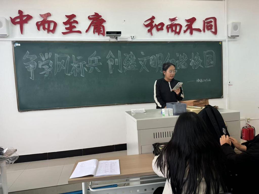 首先,团支书向同学们介绍了和谐校园的几个方面,包括遵守校规校纪,尊重师长,维护校园卫生等方面,并向同学们强调了建设和谐校园的重要性。其次团支书向同学们举例了集中校园不文明行为,来以此告诫同学们要养成良好的行为习惯。最后团支书向同学们提出建议,让同学们在日常生活中互相监督,互相提醒。