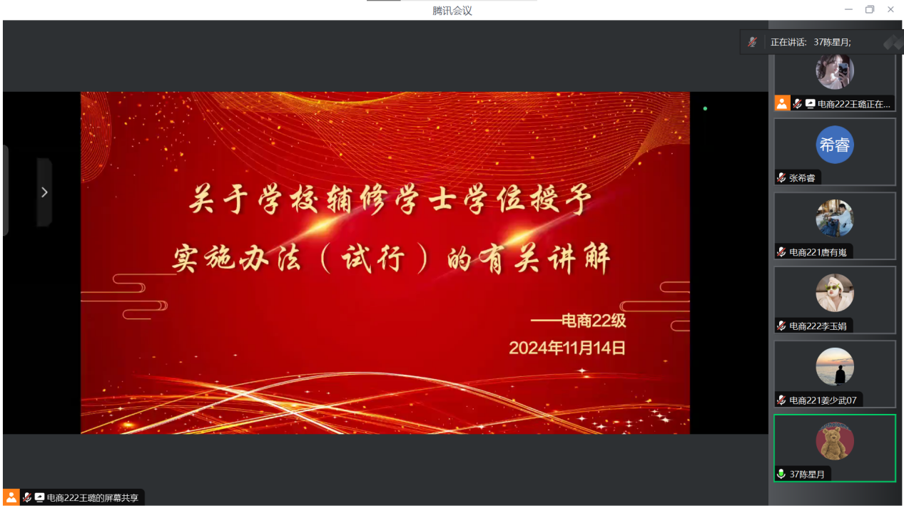 为了更好地培养社会急需的多样化、跨学科和社会适应能力强的高素质复合型人才。特此,电子商务专业于11月14日下午在线上召开“关于学校辅修学士学位授予实施办法(试行)”讲解会议。本次见面会由辅导员老师陈星月主持,电子商务专业22级全体同学参加。