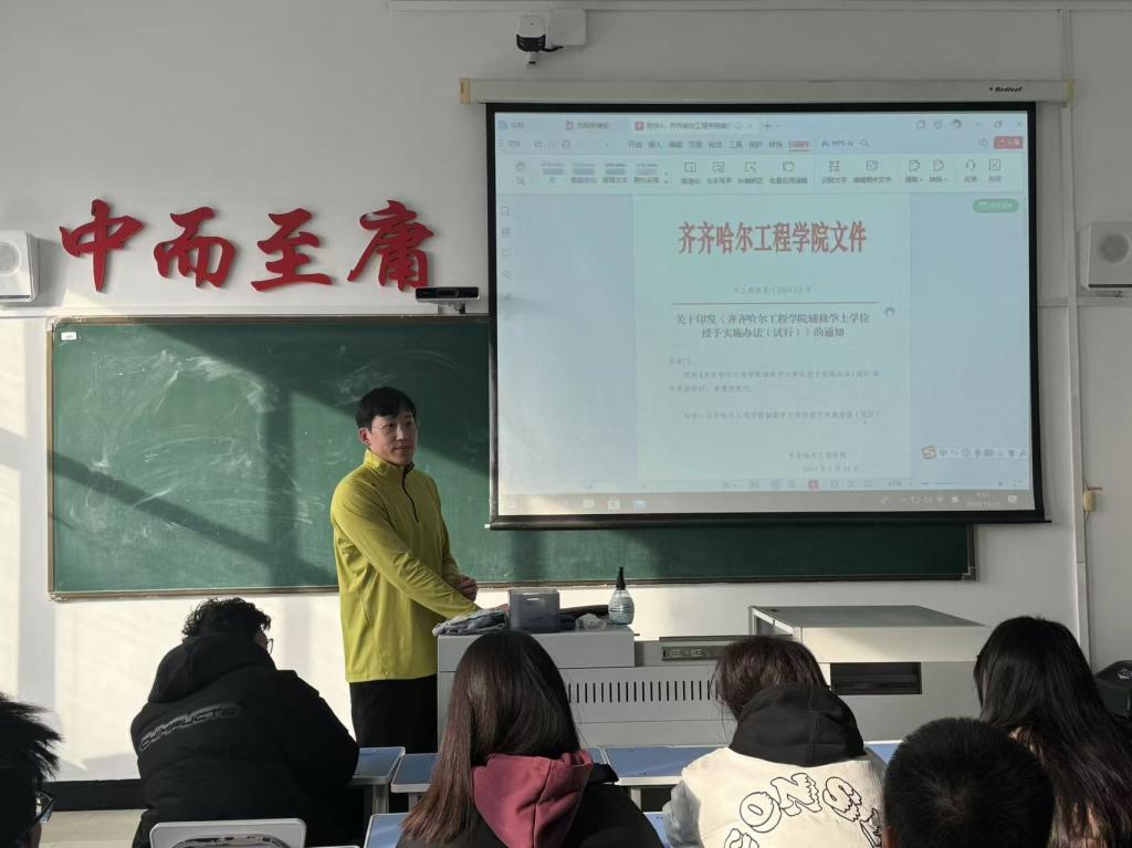 11月15日上午,信息工程系大数据241班在一号教学楼1411召开“辅修学士学位授予实施办法”主题班会,本次班会由辅导员刘铭炜主持,大数据242班共40人参加。