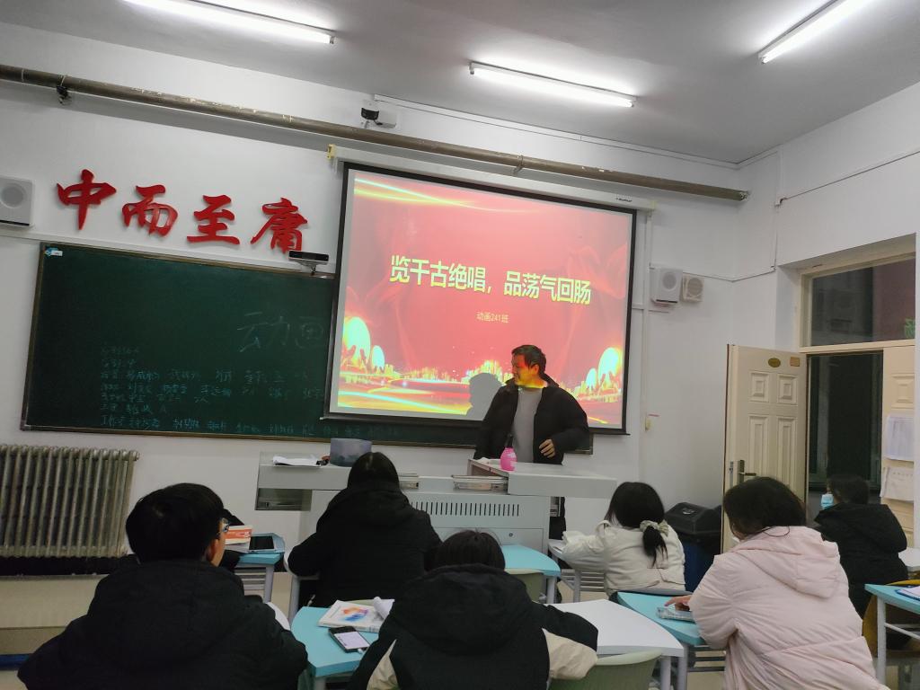 11月20日晚上,动画241班在一教A区1415教室开展以“览千古绝唱,品荡气回肠”主题话动。本次主题活动由组织委员杨金羽主持。动画241班共36人参加。