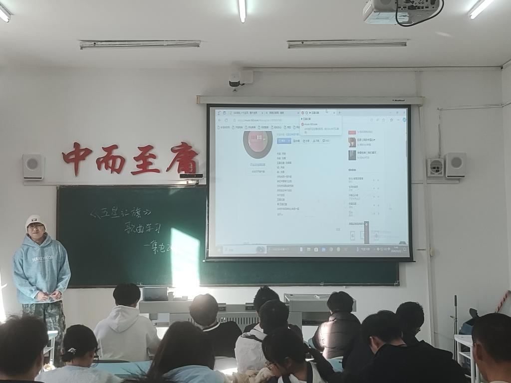 首先,孙宇轩同学向同学们介绍了《五星红旗》这首歌所蕴含的深刻意义,它不仅仅是一首旋律优美的歌曲,更承载着对祖国的热爱和对五星红旗所象征的民族精神的歌颂,每一个音符都像是在诉说着新中国一路走来的艰辛与辉煌。随后,多媒体播放出歌曲的视频,那激昂的旋律瞬间在教室里回荡,同学们聚精会神地看着歌词,跟随音乐轻声哼唱。最后,在学唱环节,孙宇轩同学逐句领唱,耐心地纠正同学们的发音和节奏,同学们热情高涨,反复练习,从一开始的生疏到逐渐熟练,声音越来越洪亮,情感也愈发充沛,同学们齐声高唱“五星红旗,你是我的骄傲”时,教室里充满了浓浓的爱国之情。