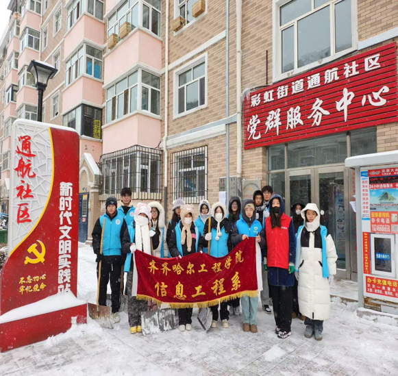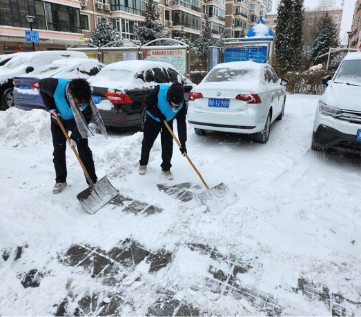 活动伊始,社区服务站的工作人员带同学们领取志愿者服装,工作人员让同学们带好手套和拿取清雪工具并带领同学们到达清雪地点,随着清雪活动的进行,同学们的额头上渗出汗珠,尽管寒风刺骨,但他们的热情丝毫未减。同学们有序地分工合作确保清理干净。最后清雪任务圆满完成,社区服务站的工作人员与同学们一同合影,记录此刻的喜悦。