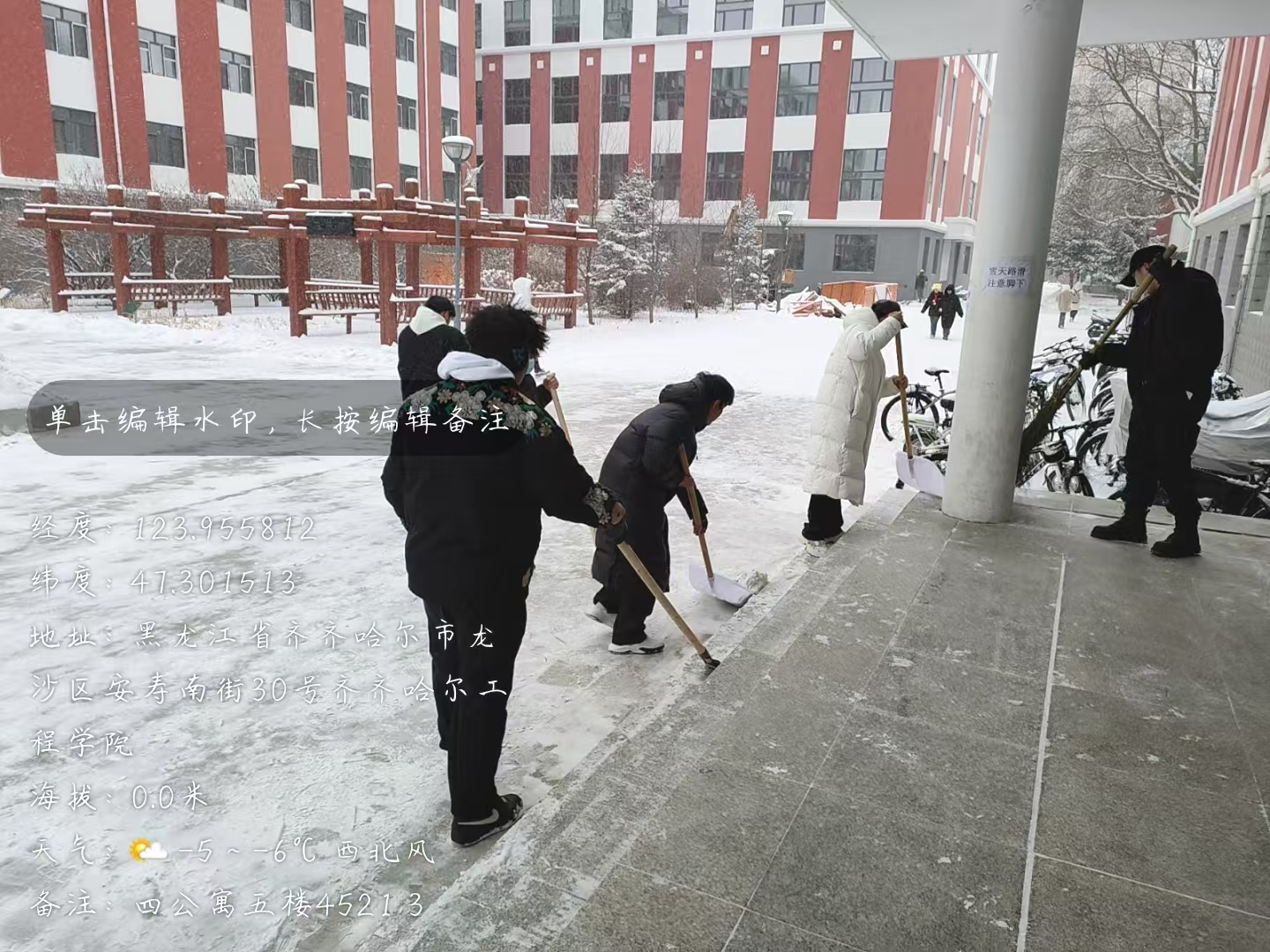 11月26日,为确保道路畅通和学生出行安全,任帅组织四公寓进行清雪活动,所有人蓄势以待。本次活动由四公寓12名工作人员参加,活动地点在四公寓公寓楼前。
