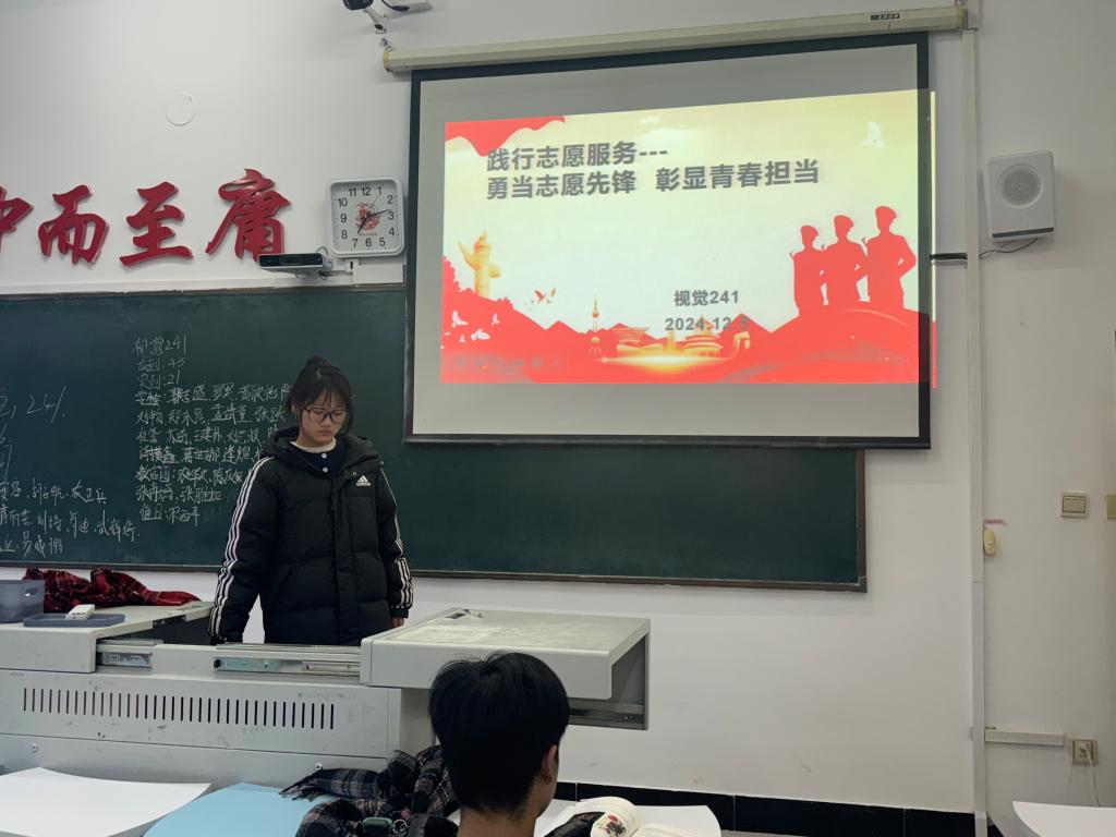 12月5日上午,视觉传达设计专业在第一教学楼1401召开“勇当志愿先锋 彰显青春担当”主题班会,本次班会会由团支书侯骄阳主持,大数据241班共46人参加。