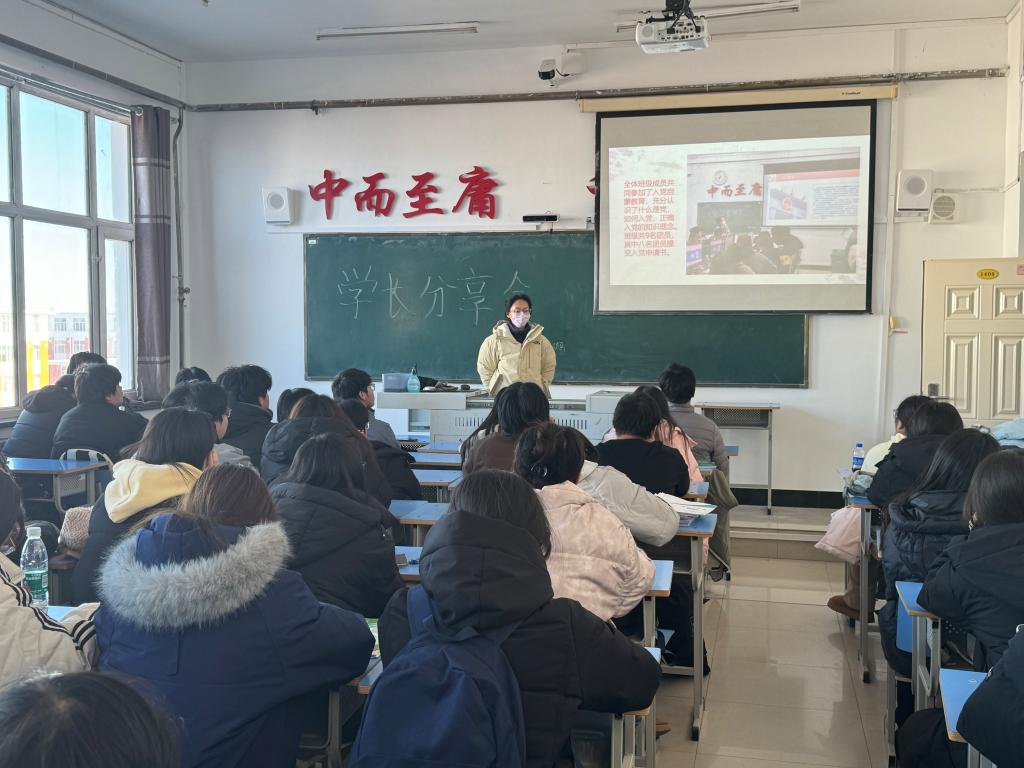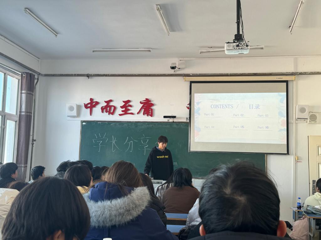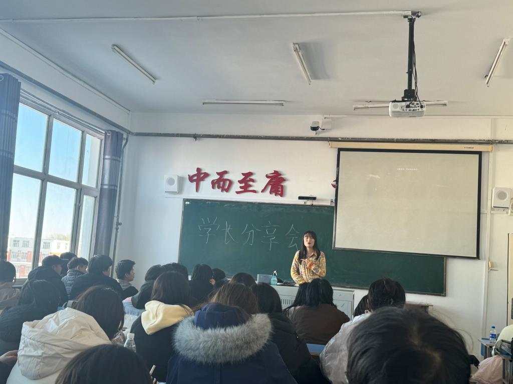学长分享会是由各个学长介绍班级基本情况和学相处的经验等问题。首先由赵长江学长对本班的基本情况进行详细介绍并分享了班级共同的荣誉,同时提出学习的重要,鼓励同学积极的面对学习。其次,李宵文学长对我们介绍了入党等情况,并积极鼓励我们参加各类活动,争取各个机会。然后郭洳彤学长对我们分享了在校活动的些经验。然后仇道真学长对本次分享会进行总结,并祝福大家学业顺利。最后张莹辅导员进行最后的总结,