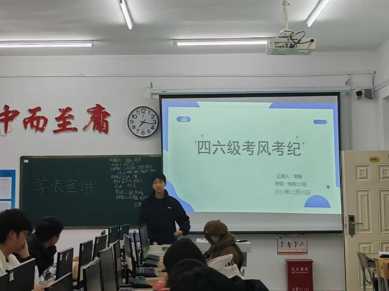 为严肃考风考纪,营造公平、公正、诚信的考试氛围,电商23级于12月11日在1教3203、3203教室召开了一场以四六级考风考纪为主题的班会。本次班会旨在加强同学们对考试纪律的重视,引导大家树立正确的考试观念