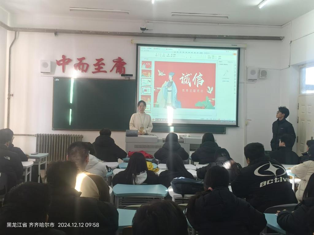 12月12日上午,计科233班在一教学区A区1415室开展以“诚信教育”为主题的班会。会议由辅导员杨佳佳主持,计科233班全员参加。