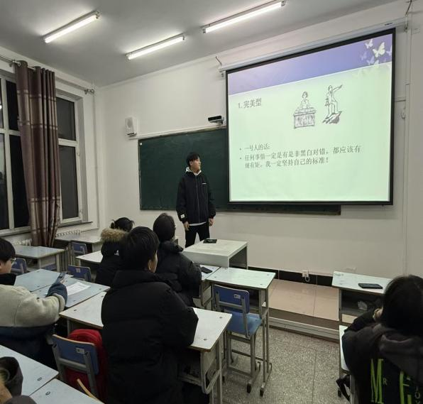 学生们分组热烈讨论,分享自身职业困惑与人格特质带来的经历。电商232班班长关海舰剖析了自身人格并讲述了在工作过程中遇到问题的化解方法,将做事方法和人格特征进行了匹配,引发学生们的思考。