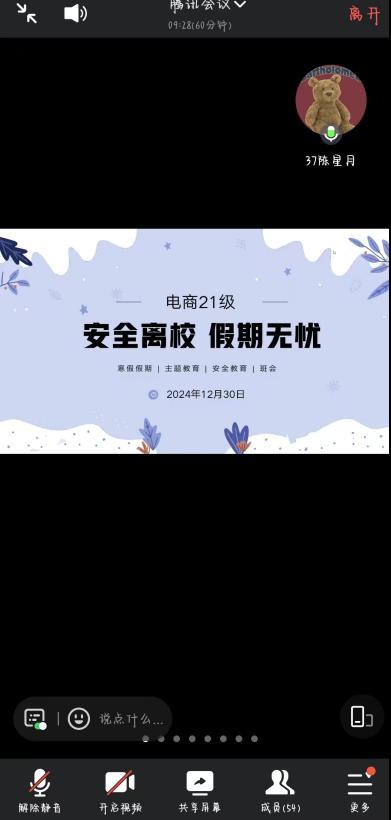 随着假期脚步的日益临近,电商21级全体同学通过腾讯会议共同参与了一场至关重要的“安心离校,假期无忧”安全教育班会。此次班会由辅导员陈星月主持,旨在全方位强化同学们的假期安全意识,确保每一位同学都能度过一个平安顺遂的假期。