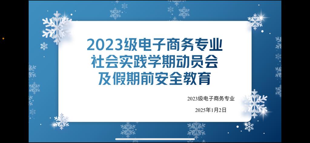 寒假即将到来,为了深入推动2023级学生的社会实践学期顺利进程,并加强假期安全教育,电子商务专业使用腾讯会议组织召开了社会实践学期动员会及假期前安全教育线上班会。