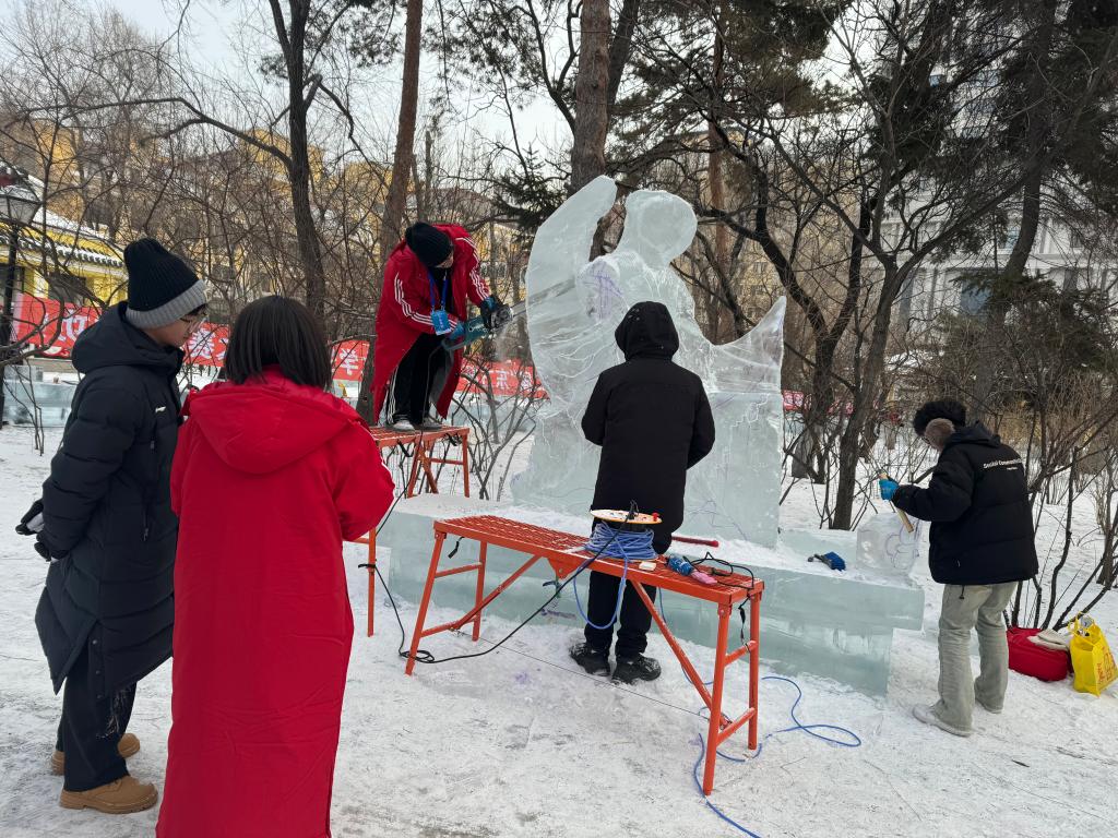 12月28日上午,哈尔滨兆麟公园迎来了一场冰雪艺术的视觉盛宴——第十九届全国大学生冰雕比赛,其聚集了来自全国各大高校的大学生团队。我校视觉传达设计专业辛明明老师带领视觉231班陈海纯、顾航嘉、邓富双三名学生参与这场比赛,他们在寒冷的天气中展现了非凡的技艺和创作才华。
