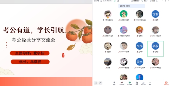 为促进毕业生高质量就业,帮助同学们更深入地了解公务员考试相关情况,解答同学们备考过程中的疑惑,1月25日下午,生涯导师董宇佳组织所带学生召开“考公有道,学长引航”考公经验分享交流会,并邀请了2013届毕业生马骐驭学长传授考公成功上岸的经验。会议由生涯导师董宇佳主持,计算机科学与技术、数据科学与大数据技术专业20余名学生参会。