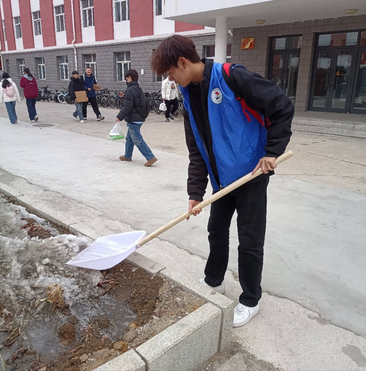 活动当日,同学们早早集合,在青工委员袁一丹的带领下,有序领取清扫工具,迅速分成多个小组,各自奔赴负责区域。随后,大家迅速领取铁锹、扫帚、推板等扫雪工具,分组奔赴各自负责区域,一场热火朝天的清扫行动正式拉开帷幕。在清扫过程中,同学们充分发挥不怕苦、不怕累的精神,认真对待每一个细节。最后,经过几个小时的辛勤劳动,校园面貌焕然一新,干净整洁的道路见证了同学们的付出与努力。