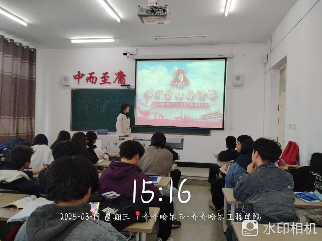 首先,团支书侯娇阳以播放一段雷锋生平事迹的视频开启班会。视频生动呈现了雷锋在平凡岗位上的诸多细节。其次,进入理论学习环节。团支书侯娇阳细致解读雷锋精神的核心要点,通过列举雷锋日记里的经典语句 以通俗易懂的方式阐释了雷锋为人民服务的奉献精神。着重指出雷锋精神在新时代依旧具备的价值,堪称引领社会风尚、助力个人成长的鲜明旗帜。最后团支书侯娇阳对本次班会进行全面总结,鼓励大家将雷锋精神落实到行动上,从身边点滴小事着手。