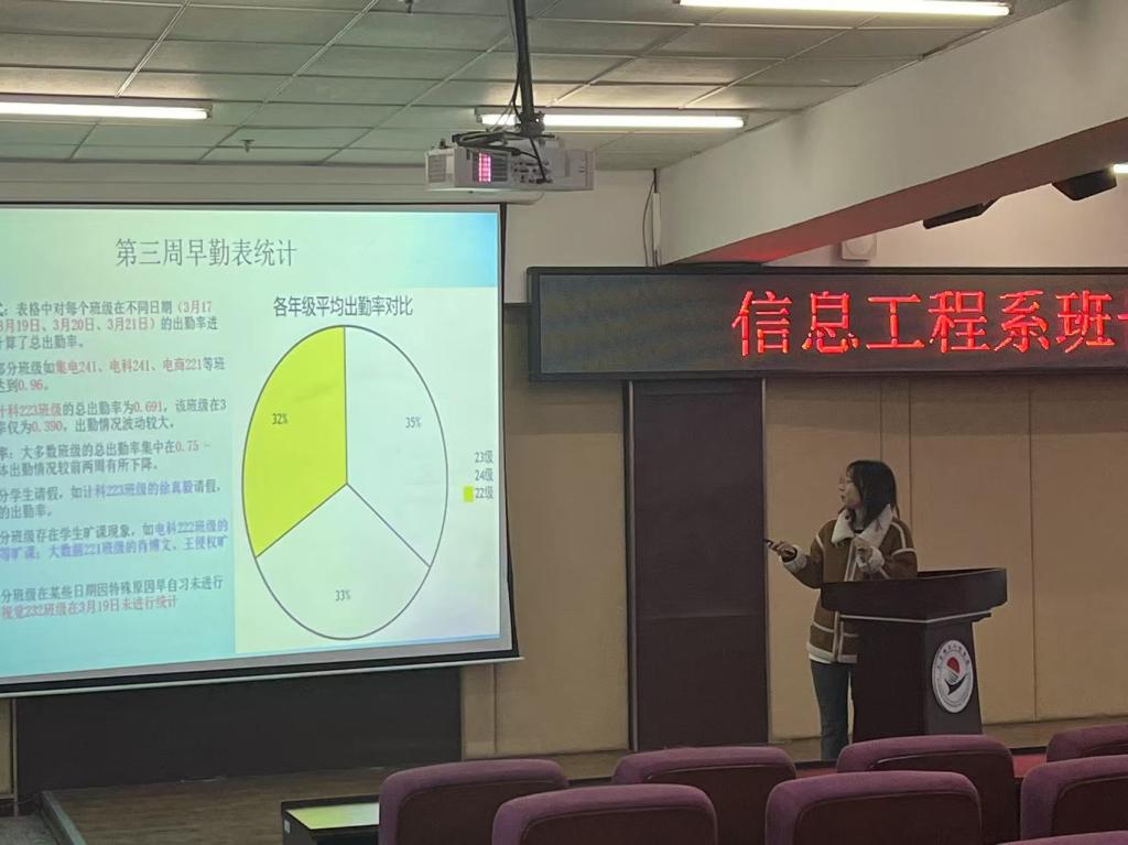 紧接着,信息工程系主席朱薇上台分享近期早自习与德育工作情况。早自习整体出勤率不错,可部分同学精神欠佳、学习劲头不足;德育方面,多数同学能守规,但校园文明行为仍有提升空间。朱薇强调,这些表现关乎系部风貌,与审核评估紧密相关,希望大家共同改进 。
