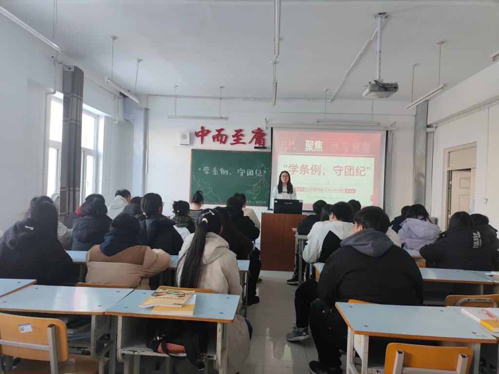 团课上,班级团支书赵铭方首先带领大家学习了《中国共产主义青年团章程》,详细讲解了团组织的性质、宗旨、任务以及团员的基本义务和权利。随后,重点介绍了《中国共产主义青年团纪律处分条例(试行)》,明确了团纪处分的种类、适用情形及处理程序。