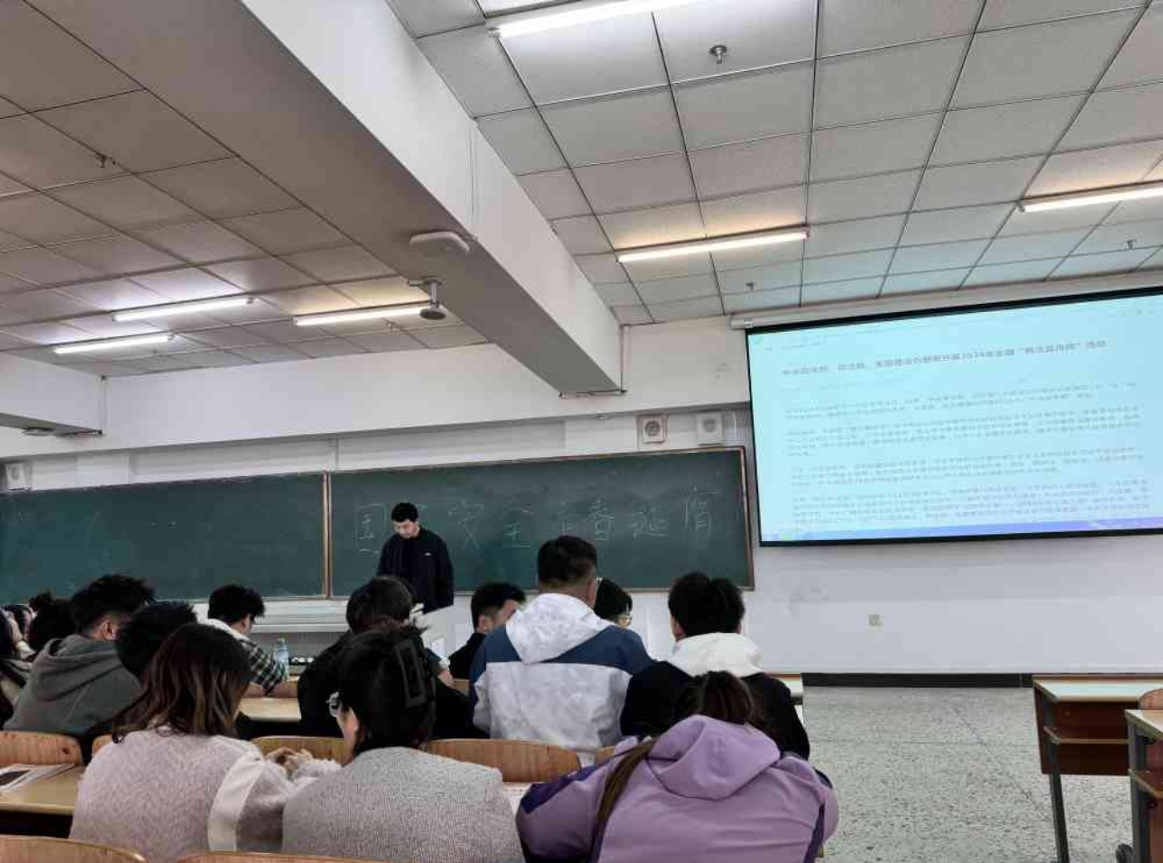 首先,团支书详细介绍了今年是国家安全法颁布施行10周年,以及即将到来的全民国家安全教育日的重要意义。团支书详细阐述总体国家安全观,通过精心制作的PPT,深入讲解政治安全、国土安全等多领域知识,同时列举现实案例,如网络窃密事件,让同学们深刻认识到国家安全的重要性与复杂性。其次,组织热烈的小组讨论,同学们踊跃发言,分享对国家安全的理解和感悟。最后,有的同学谈到维护文化安全对传承民族精神的意义,还有同学从日常生活出发,提出警惕境外势力渗透的具体做法。