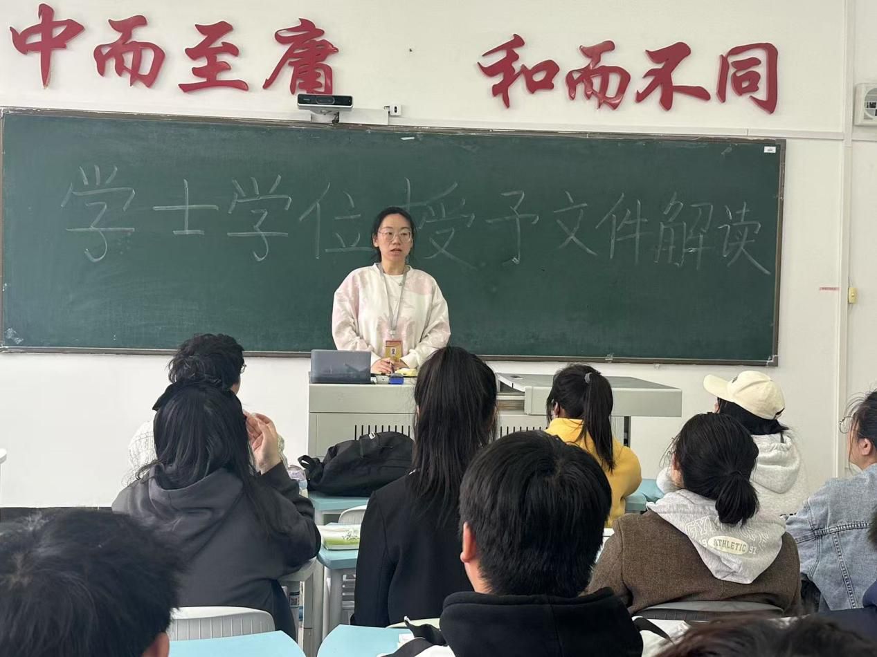 最后,辅导员杨佳佳对本次班会进行总结,强调学士学位是大学学习成果的重要体现,关乎同学们的未来发展。希望大家以此次班会为契机,认真研读文件,根据学位要求制定个性化学习计划,合理规划大学生活,在今后的学习中勤奋努力,争取都能顺利获得学士学位。