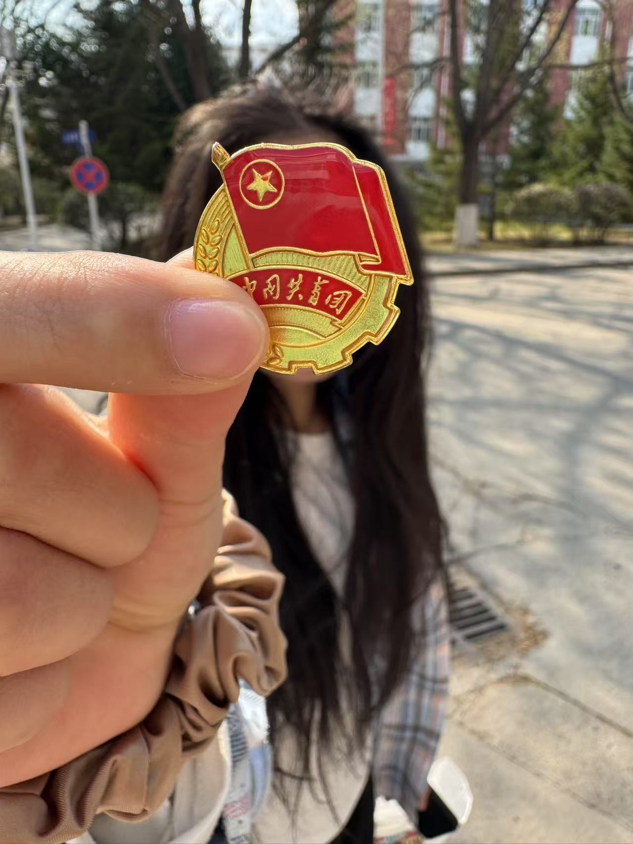 首先,团支书王菁遥向团员们讲述了团旗团徽的深刻内涵与重要意义,让大家对共青团的历史和使命有了更深入的认识。随后,同学们怀着崇敬的心情,手持鲜艳的团旗,佩戴闪亮的团徽,纷纷寻找校园中最具意义的角落进行合影。最后,在校园的花园小径旁,同学们或高举团旗,或轻抚团徽,以青春的姿态与团旗团徽定格美好瞬间;在庄严的教学楼前,大家排列成富有创意的队形,让团旗团徽成为画面的焦点。每一张照片,都洋溢着同学们对共青团的热爱与自豪。