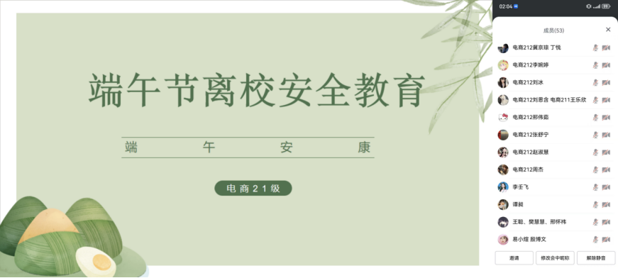 5月29日下午,电商21级借助腾讯会议平台召开端午节离校安全教育主题班会。本次会议由辅导员陈星月主持,电商21级全体同学参加会议。
