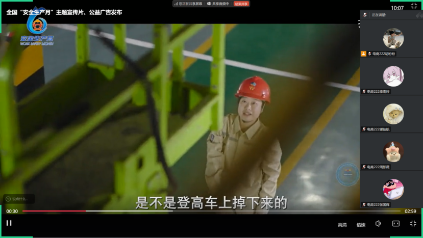 为强化班级同学的安全责任意识,提升应急处理能力,将 “安全第一、预防为主” 的理念深植于心,6月11日上午,信息学院电商 222 班在线上腾讯会议开展 “安全生产月” 主题观影活动。此次活动由团支书胡盼盼主持,电商 222 班全体同学参与。