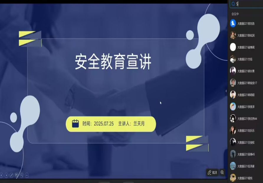 7月25日下午,为了推进同学们的就业,树立良好的劳动精神、安全意识,大数据221班、222班线上开展“就业推进·实习劳动·安全教育”三位一体班会,由导员兰天月主持。