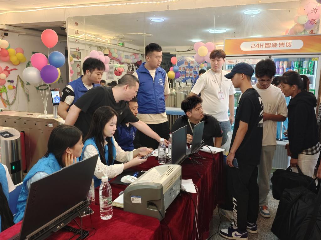 迎新现场拥有着高效有序的报到流程。公寓楼前设置了清晰的指引牌和服务台,新生和家长可快速了解报到流程。在志愿者协助下,新生依次完成身份核验、信息登记。完成报到后,新生在四公寓志愿者的引导下,开启自己的“新家”生活。