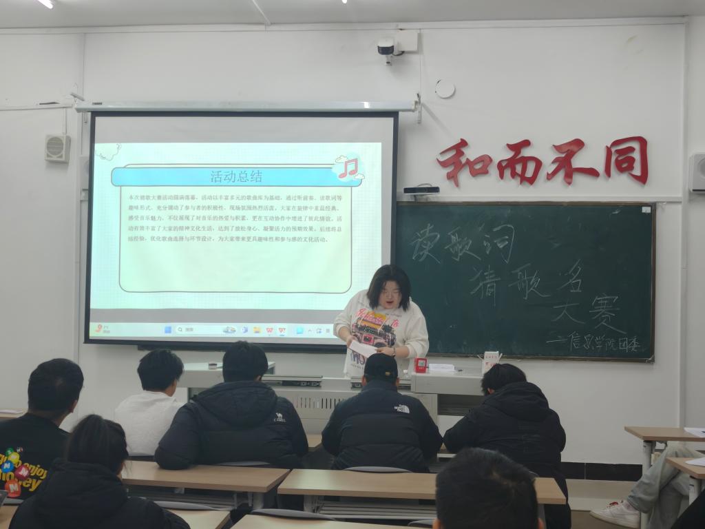 首先,活动以“读歌词+限时抢答歌名”为核心流程推进:主持人依预设环节依次呈现不同内容的歌词素材,配套明确了抢答规则与计分方式,整场活动的环节衔接顺畅,节奏紧凑且现场秩序良好,按既定流程完成了全部竞猜内容。其次,活动的歌词素材设置具有多元性:覆盖了不同年代、不同风格的音乐作品,既包含当前校园群体关注度较高的流行曲目,也纳入了具有一定文化传播性的经典作品,契合活动作为课余文化互动平台的定位。最后,此次活动达成了信息学院团委的预设目标:以轻松的竞技形式丰富了校园课余文化生活,同时借助音乐内容的共性载体,实现了不同年级、专业学生的集体参与,进一步拓展了校园文化活动的参与覆盖面,活跃了轻松温暖的校园氛围。