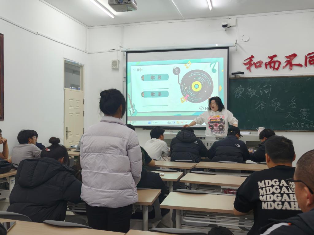 11月12日下午,信息学院团委在一号教学区1402教室开展了“读歌词猜歌名大赛”,此次活动由计科244班团支书袁一丹主持,信息学院的学生参与其中。